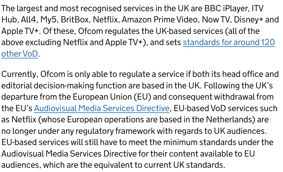 Currently, Ofcom regulates platforms like Amazon Prime Video and Disney+ (but not Netflix or Apple TV+) under On-demand programme services (ODPS) rules.